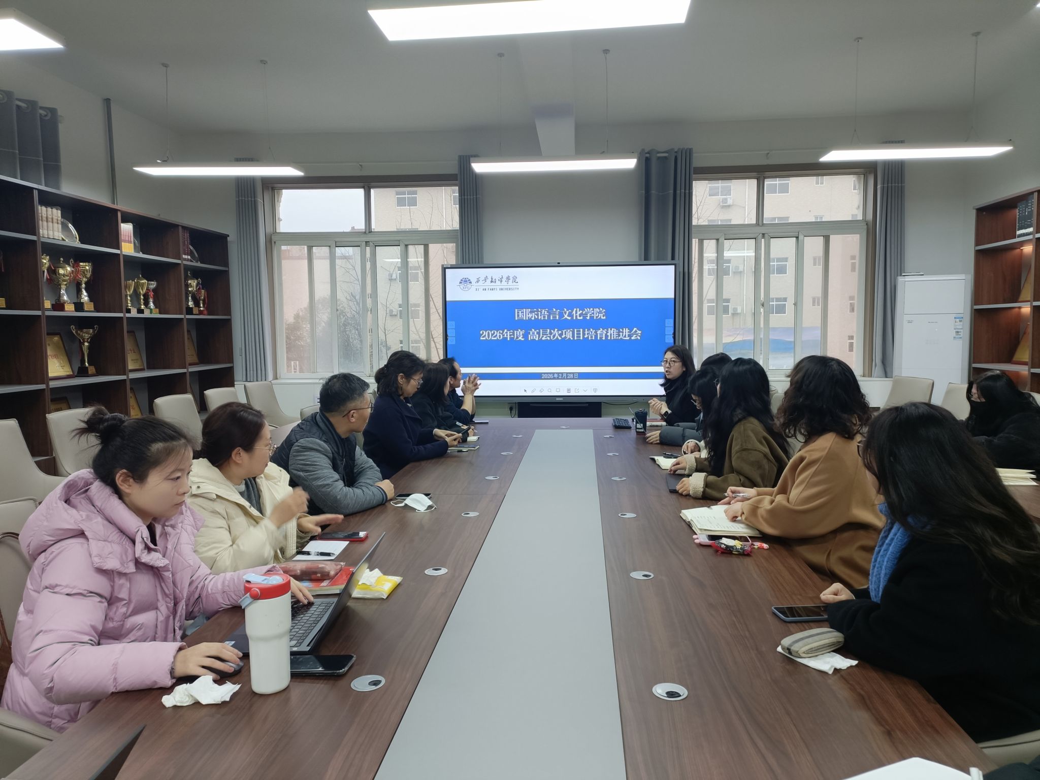 为落实学校人才强校战略,扎实推进2026年度高层次科研项目申报工作,聚焦第四轮申报书打磨关键环节,精准破解申报书撰写中的难点问题,2026年2月28日上午,国际语言文化学院召开高层次项目第四轮申报书打磨推进会。学院领导班子、科研骨干及拟申报项目负责人参会,会议由学院科研副院长魏海燕主持,核心围绕申报书打磨开展专题研讨与指导。