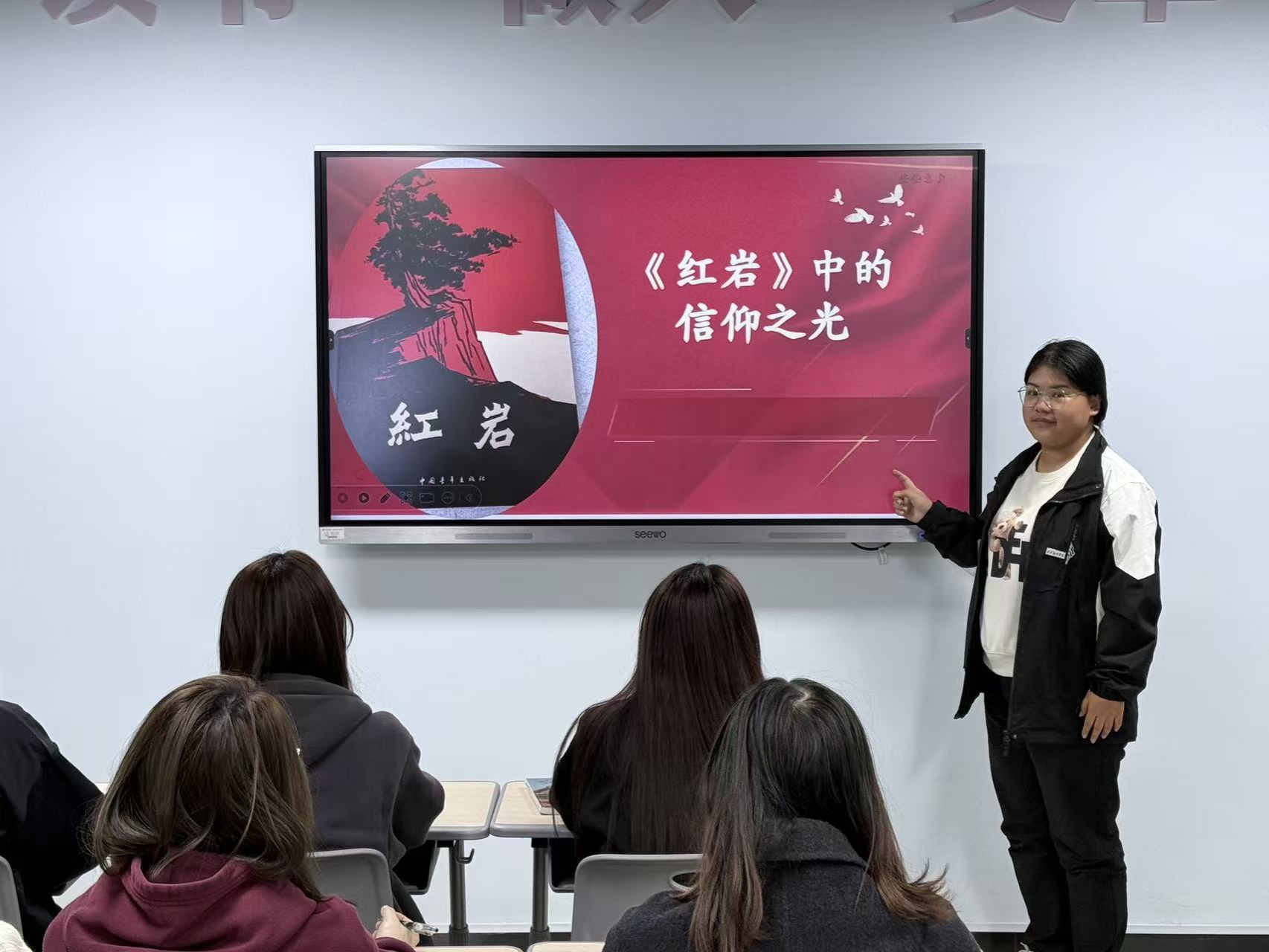 最后分享的书籍是《红岩》,深情讲述了书中江姐、许云峰等革命者坚贞不屈的感人事迹。分享的同学特别提到“红岩魂”所代表的精神内核——那是信仰如铁、意志如钢的共产党人品格。在她动情的叙述中,现场同学仿佛重回那段风雨如磐的岁月,深刻感受到什么是用生命捍卫的忠诚,什么是在至暗时刻仍不灭的理想之光。