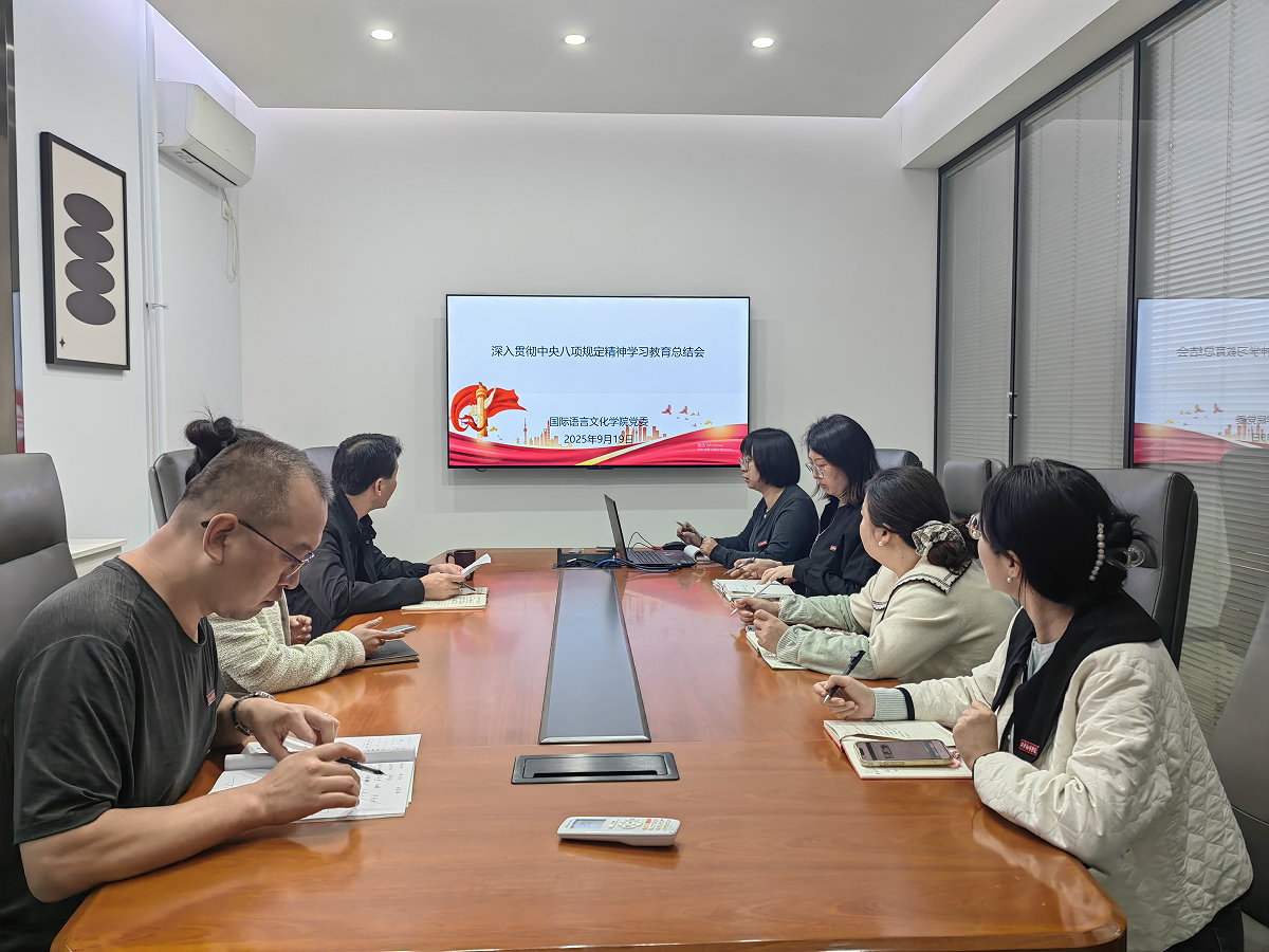 9月19日下午,国际语言文化学院党委召开深入贯彻中央八项规定精神学习教育总结会。学院党委书记、党委委员和各党支部书记参会,全面总结学习教育成果,部署作风建设常态化长效化工作。会议由党委书记宇文永康主持。
