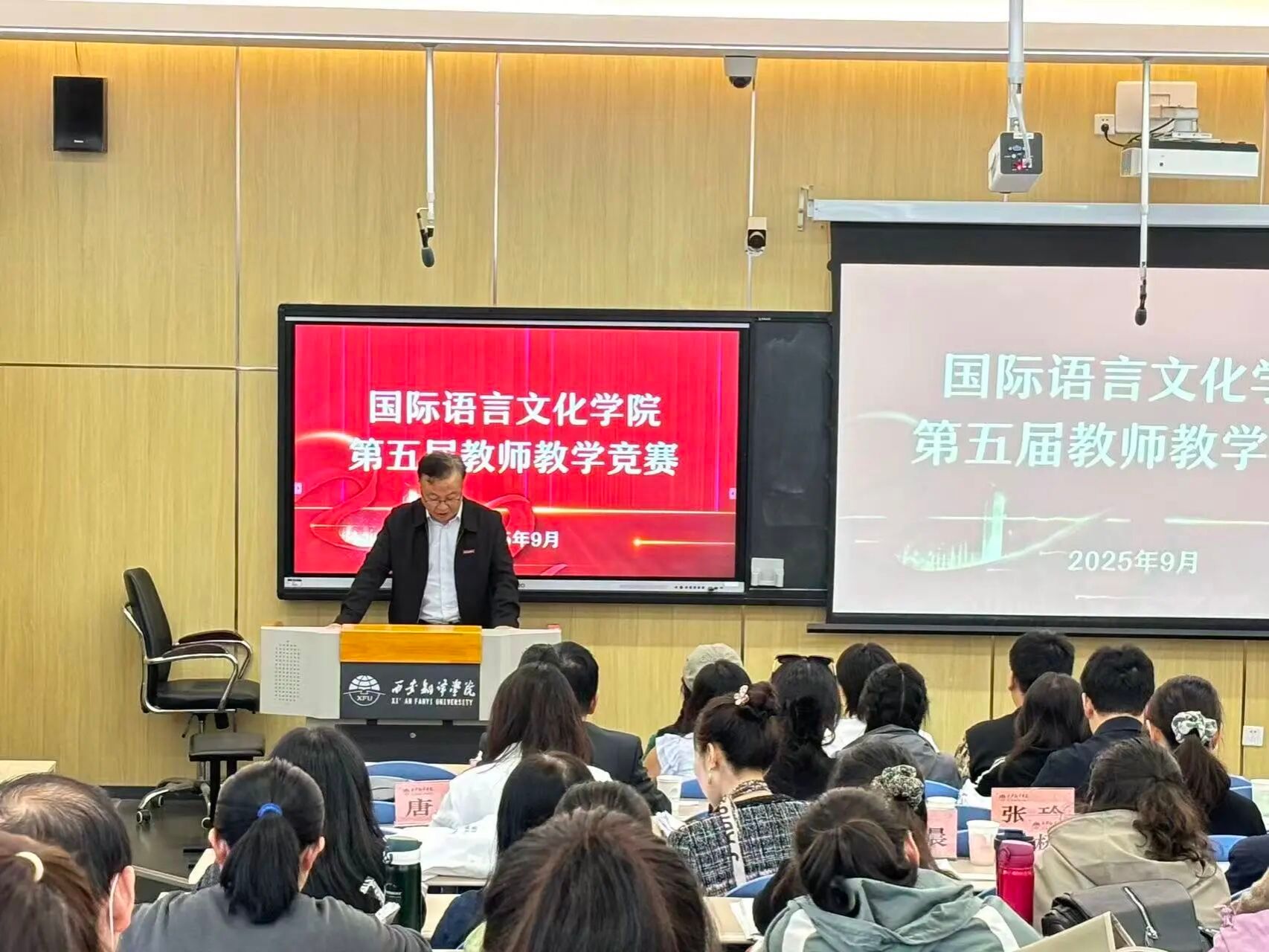 本次大赛由国际语言文化学院教学副院长吴震主持。邀请原西安外国语大学副校长姜亚军教授,西安外国语大学旅游学院人工智能学院院长庞闻教授,西安外国语大学国家级一流课程负责人,省级教学大赛一等奖卢珊副教授,国家级一流课程负责人唐洁副教授,西安理工大学国家级教学大赛二等奖张玲副教授,省级教学大赛二等奖宋雨晨副教授,西安翻译学院马克思主义学院院长杨学兵担任评委。西安翻译学院副校长郭炜、国际语言文化学院院长李庆明出席比赛现场。