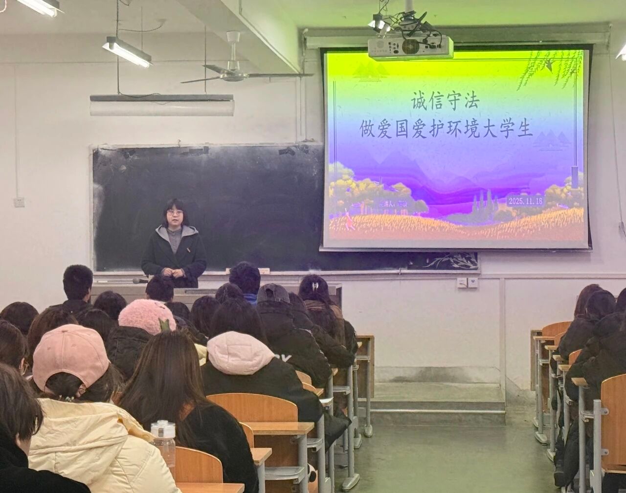 为深入贯彻落实立德树人根本任务,增强学生的法治观念、爱国情怀、诚信意识与环保责任感,11月16日-20日期间,国际语言文化学院组织各年级成功召开了“诚信守法,做爱国爱护环境的大学生”主题班会。此次主题班会由辅导员主持,全体学生参加。