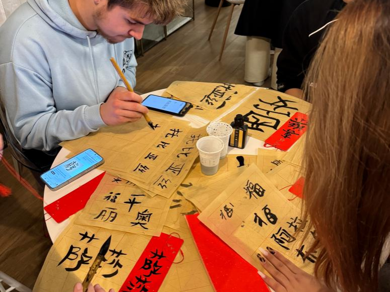 为深化中西语言文化互鉴,提升国际化办学实效,西班牙当地时间11月27日晚,西安翻译学院与西班牙瓦伦西亚Hispania语言学校共同策划的“吉祥字·中国书法体验活动”成功举办。本次活动由西安翻译学院西班牙语专业教师樊星缨主讲,我校赴瓦伦西亚游学项目学生协同组织。活动吸引了来自全球三十余名学生积极参与,现场氛围热烈,文化互动成效显著。Hispania语言学校校长安娜·梅斯·罗德里格斯亲临现场,对双方持续深化文化教育合作表示高度认可与支持。