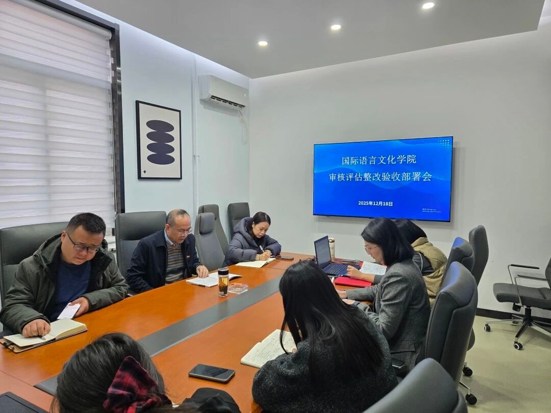 为深入落实学校审核评估整改验收迎评动员大会精神,压实学院迎评责任、统一思想共识,12月18日上午,国际语言文化学院召开审核评估整改验收迎评工作推进会。院长李庆明,教学副院长吴震,综合办主任张青丽,各专业主任及院级督导参会,会议由李庆明主持。