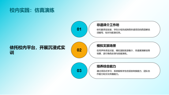 引入非遗传承人、行业专家走进课堂,开展“双师同堂”教学。依托实验室打造“校内 - 校外 - 云端”三维联动模式,开展非遗译介工作坊及新媒体账号运营,开发虚拟仿真实训平台,并与省内重点景区合作开发实践项目。